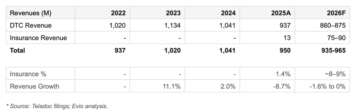 BetterHelp is a very different story. The company thrived as a DTC cash-pay business within Teladoc during and post-COVID, reaching $1.1 billion in revenue. But as of 2025, insurance revenue was still under 2% of the mix. The DTC engine is now in structural decline.