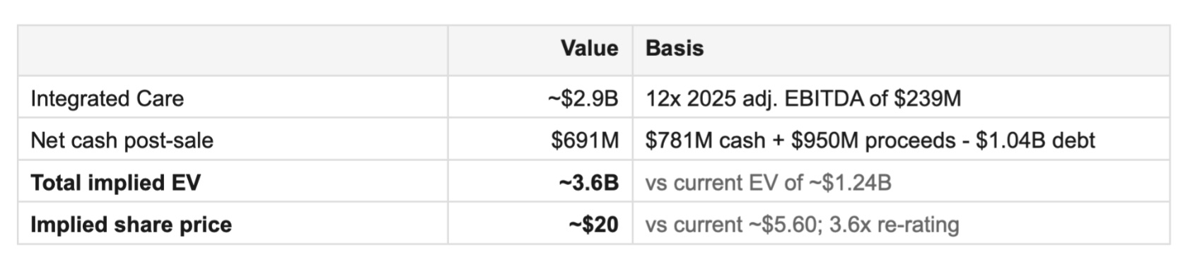 With that valuation, The Sum Of the Parts math is stark. Standalone Integrated Care at 12x EBITDA is worth roughly $2.9B. Net cash post-sale is roughly $691M. Total implied EV of $3.6B. The stock trades at $1.2B today. That’s a 66% discount!